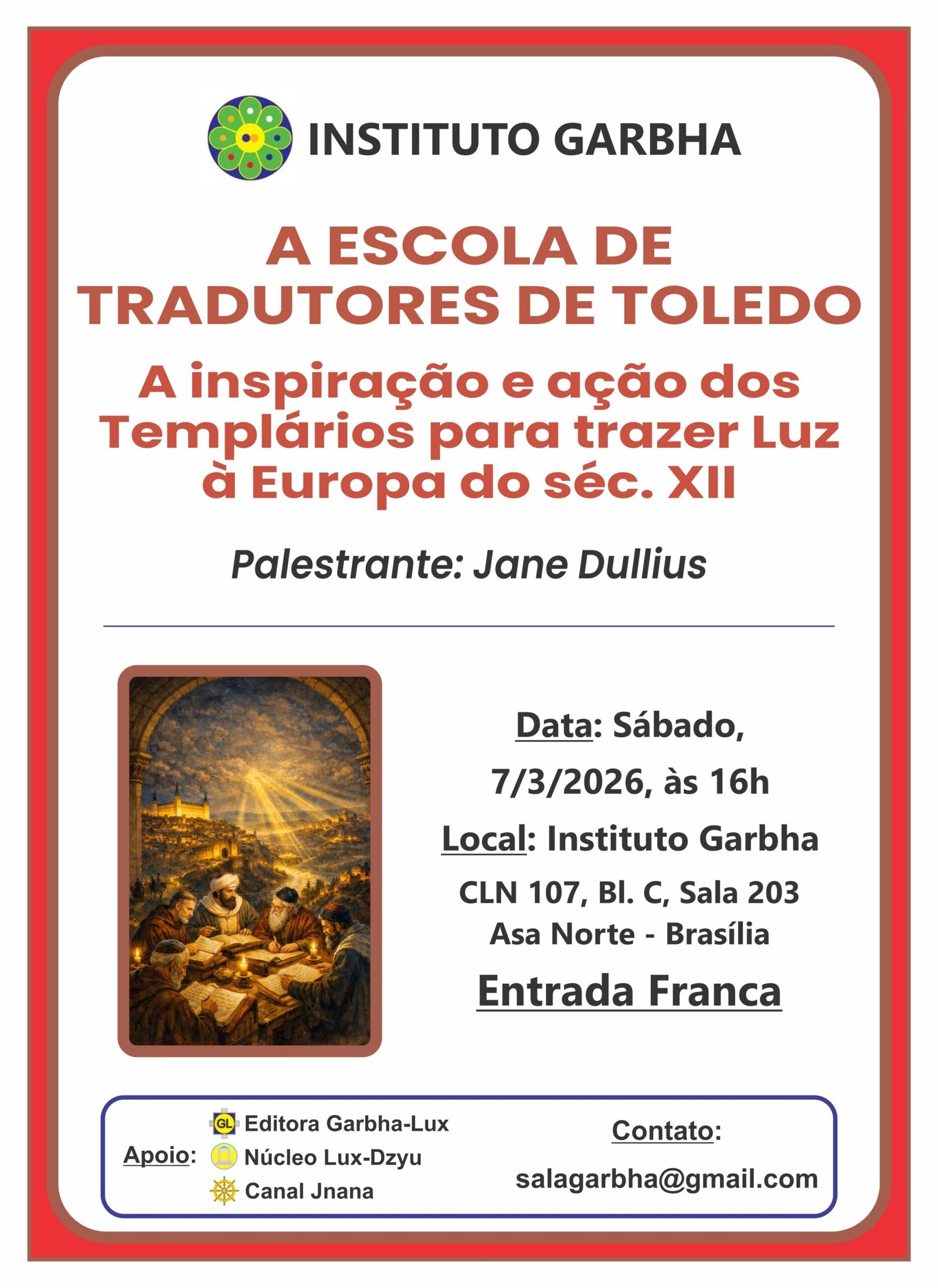 Instituto Garbha CLN 107, Bloco C, Brasília, Distrito Federal, Brazil"A Escola de Tradutores de Toledo - A inspiração e ação dos Templários para trazer Luz à Europa do séc. XII"