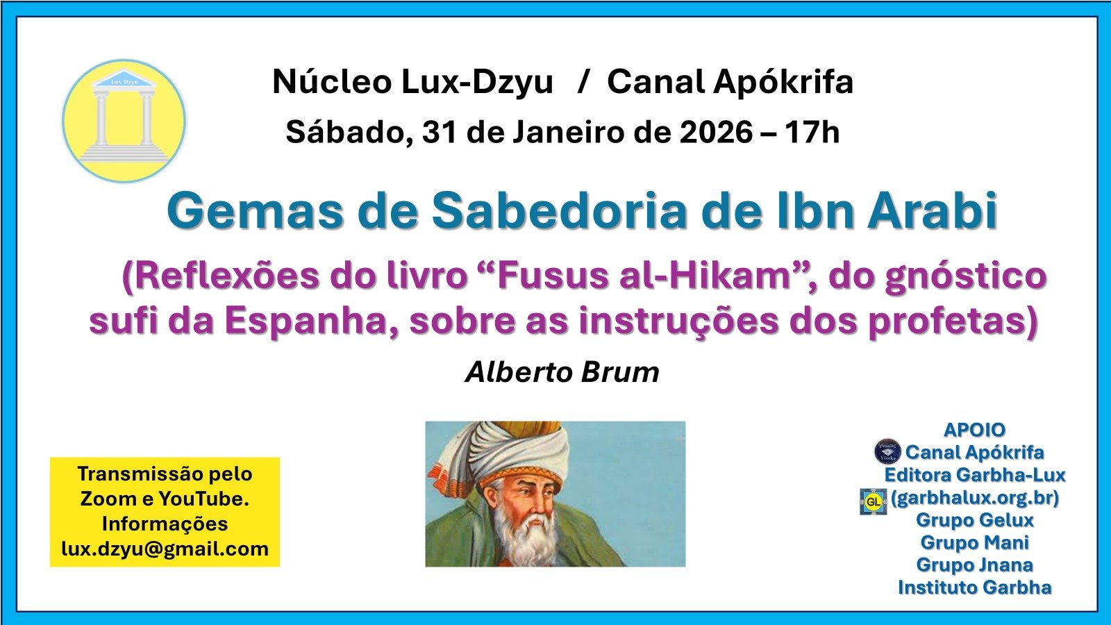 Palestra pública online ao vivo pelo Zoom e pelo YouTube Gemas de Sabedoria de Ibn Arabi - Reflexões do livro "Fusus al-Hikan", do gnóstico sufi da Espanha, sobre as instruções dos profetas Sábado, - 31/1/26 - 17h Para mais informações clique no título |