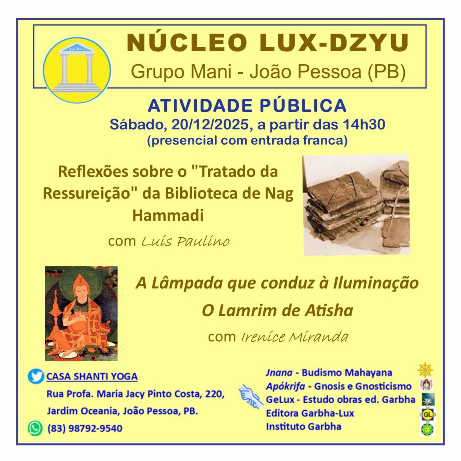 Grupo Mani promove as palestras públicas - Reflexões sobre o "Tratado da Ressurreição" da Biblioteca de Nag Hammadi - com Luis Paulino Sábado, 20/12/2025 - às 14h30 O evento é presencial e com entrada franca! Clique para obter mais informações |