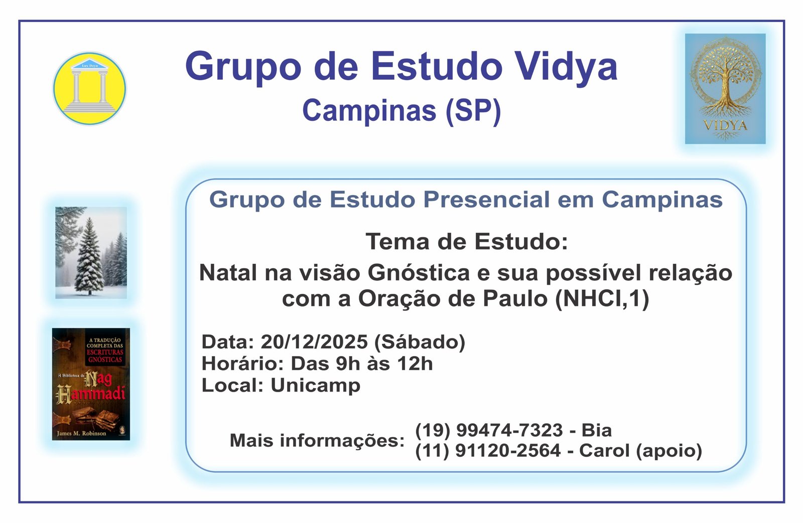 Convidamos a todos de Campinas e região a participarem do próximo encontro presencial. Tema de estudo: Natal na visão Gnóstica e sua possível relação com a Oração de Paulo (NHCI, 1) Dia 20/12/25 - às 9h - Unicamp Para mais informações, clique no título.